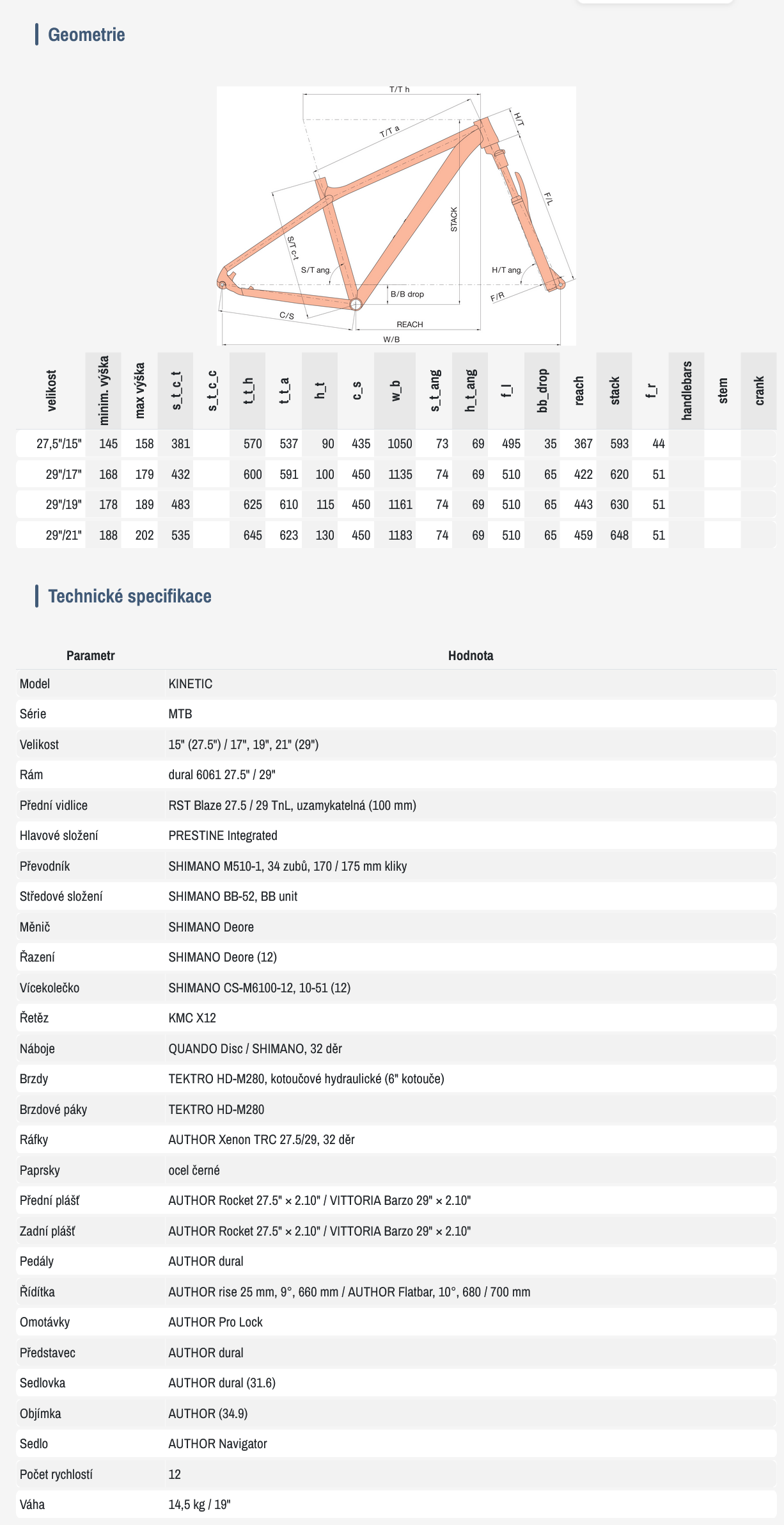 Cenově nejdostupnější model horského kola se řazením 1×12. Author Kinetic je postavený na duralovém rámu s vnitřním vedením. Vidlice RST BLAZE disponuje širokými možnostmi nastavení podle hmotnosti jezdce a jízdního stylu. Vidlice je provedena v designu kola, což přispívá k luxusnímu vzhledu. O změnu převodů se stará spolehlivá a odolná sada Shimano Deore, zde v provedení 1×12 rychlostí. Brzdí osvědčené hydraulické kotoučové brzdy Tektro TR160. Zapletená kola jsou tvořena vlastními ráfky Author Xenon a kvalitními značkovými plášti Vittoria Barzo. Zbytek osazení tvoří vlastní komponenty značky Author. Rám i vidlice samozřejmě disponují montážními otvory na uchycení stojánku, blatníků i nosiče. Dobře postavené kolo s funkčními a odolnými komponenty za rozumnou cenu to je Author Kinetic, který v sobě nezapře sportovního ducha.