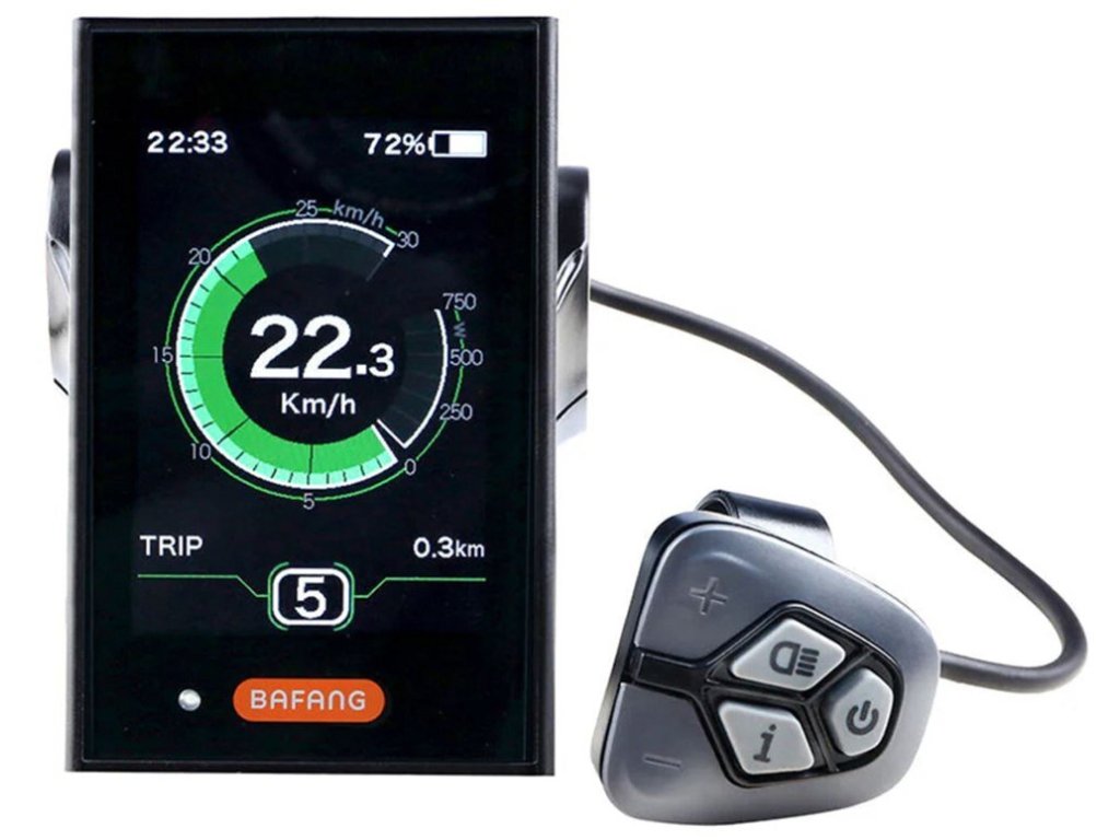 Přehledné rozhraní – zobrazuje rychlost, stav baterie, úroveň asistence, čas, dojezd, denní a celkovou vzdálenost, výkon motoru a další důležité informace.