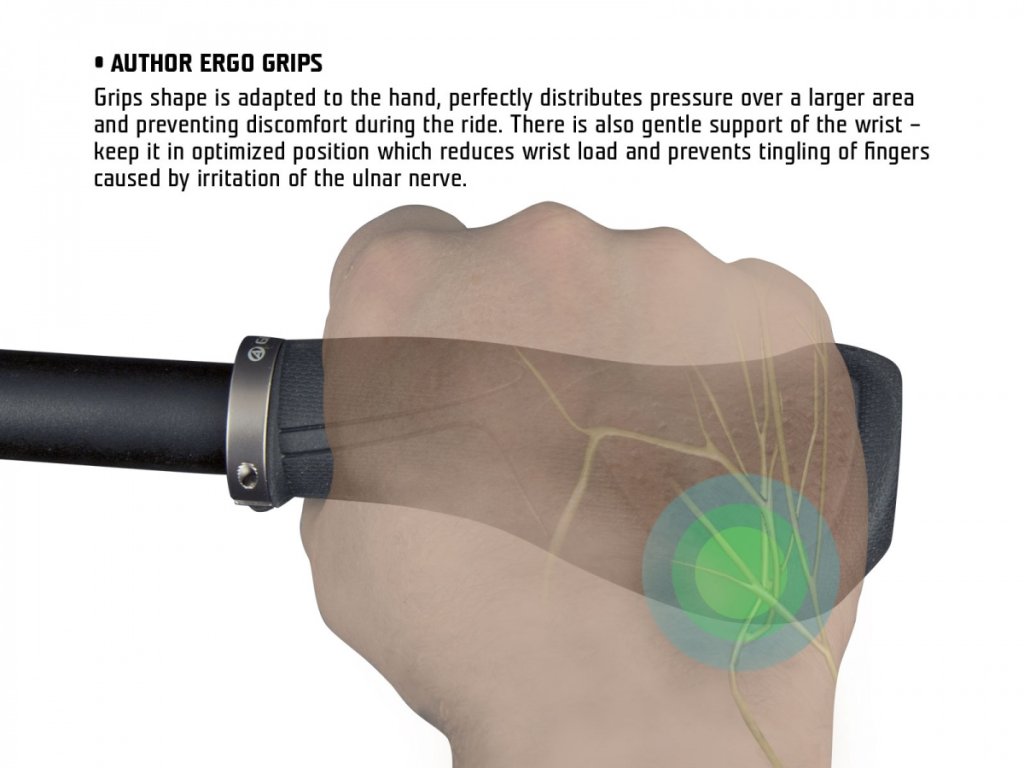 Ergonomické gripy AUTHOR R55 pro velmi pohodlný úchop a podporu rukou.