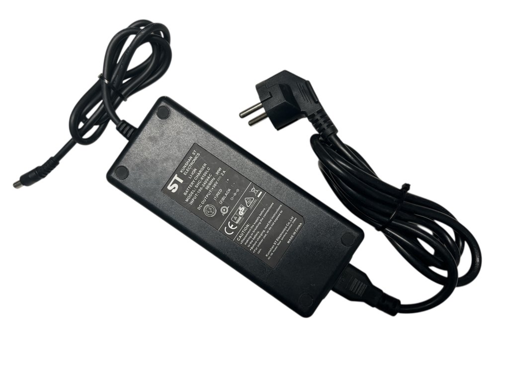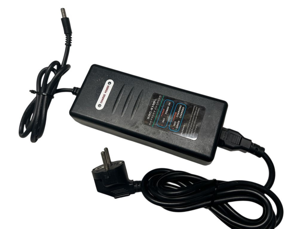 Použitá nabíječka pro nosičové baterie N4 a rámové baterie R1, R5, R6, R7, I1, I4, I5 a páteřové S2. S konektorem jack 5,5mm.