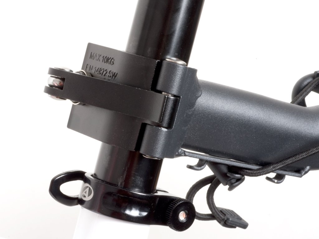 Materiál AL6061, univerzální úchyt na sedlovku d. 25 - 34mm, rychloupínací páčka pro snadnou a rychlou montáž / demontáž. Nosnost nosiče 10kg (nosnost je limitována pevností sedlovky), ložná plocha 29x11cm, hmotnost 730g. Tento nosič vyžaduje odbornou montáž.