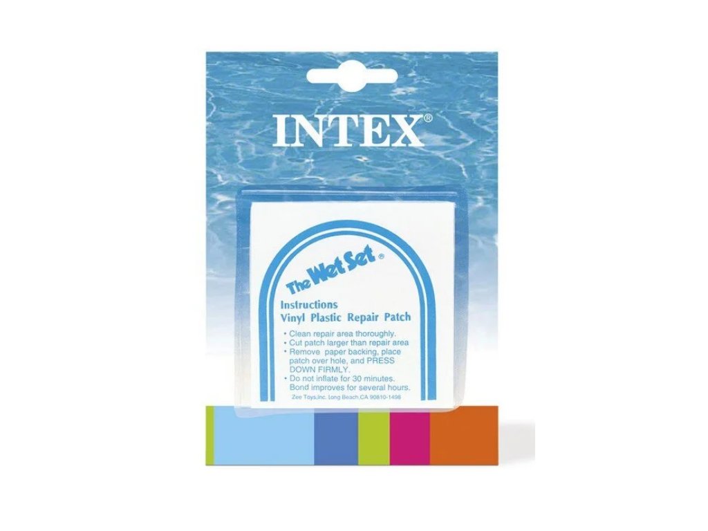 Opravná sada Intex obsahující samolepící záplaty na nafukovací hračky, plovací pomůcky, bazény a další výrobky z vinylu. Jednoduše si odstřihnete záplatu o potřebné velikosti (větší, než je poškození), odejmete papír z lepící části, přiložíte a necháte odpočinout.