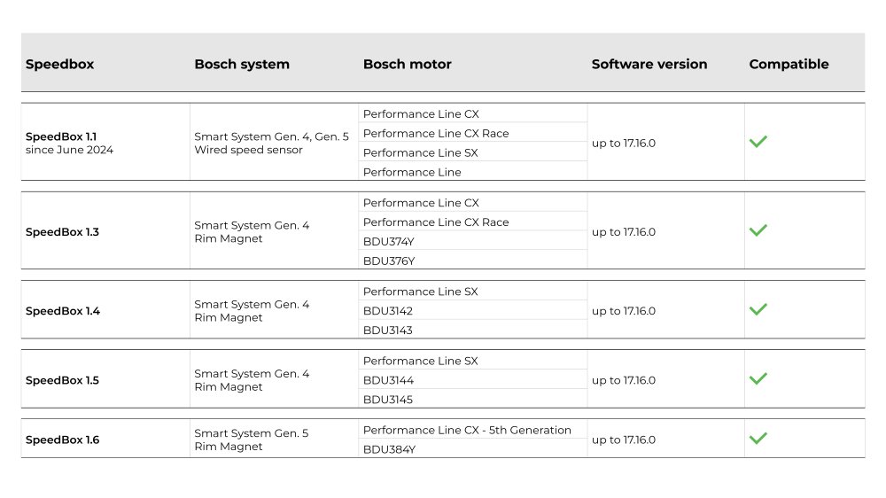 Upozorňujeme, že provoz takto upravených elektrokol na pozemních komunikacích může být v rozporu s platnou legislativou některých zemí. Výrobce nenese odpovědnost za škody vzniklé použitím produktů SpeedBox. Elektrokola vybavená produkty SpeedBox není dovoleno používat na pozemních komunikacích, cyklostezkách a veřejných prostranstvích. Použití je možné výhradně na soukromém pozemku a na vlastní riziko. Použitím produktů SpeedBox může dojít ke ztrátě záruky tvého elektrokola.